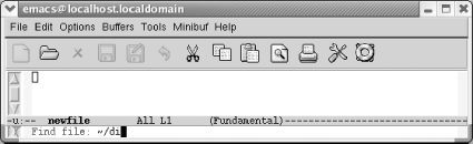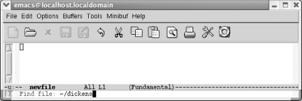 1.7. Opening a FileYou can open a file by specifying the filename when you start Emacs from the command line or by typing C-x C-f (the long command name is find-file). The paper icon on the toolbar also runs this command. In some applications, a similar icon simply creates a new, unnamed file (e.g., Document1 in Word). Emacs expects you to provide a filename, as we'll see in a moment.