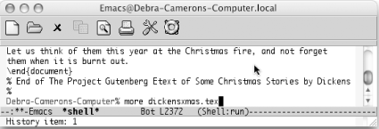 In this example, the previous command was more dickensxmas.tex. It's no longer on the screen; its output has pushed it off the top. M-p (for comint-previous-input) retrieves the command, but doesn't execute it; you can edit the command before pressing Enter. To find subsequent commands, type M-n. If these commands sound familiar to you, they should. They are history commands, which are identical to the minibuffer history commands we discussed in Chapter 3. The In/Out menu is devoted to working with command history. Enter and Tab have special functions in shell mode. Pressing Enter executes the command on the line where the cursor is, even if you move the cursor up to the line of an earlier command you want to execute again. When you press Enter, Emacs copies the command to the end of the buffer and executes it. Of course, you can modify the command before pressing Enter. Pressing Tab puts the Emacs completion feature into action; use completion for operating system commands, filenames, and variables. Note that the completion of system commands works best on Unix implementations like Linux and Mac OS X; Emacs doesn't seem to find all the possible Windows commands, for example. If you type a command that produces a lot of output, cluttering up your session, there's an easy way to get rid of it. Type C-c C-o (for comint-kill-output).