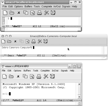 5.1.2 Using Shell ModeNow we're ready to discuss shell mode, the interactive facility for running commands. To start a shell buffer, type M-x shell Enter. This creates a buffer named *shell*. You see the prompt for your shell within this buffer. (This defaults to your usual shell; you can substitute another shell to use in Emacs. See "Which shell?" later in this chapter.) Figure 5-1. Shell buffers for Linux, Mac OS X, and Windows![]() For the most part, shell mode is exactly like the normal command interface, except that you can use Emacs to edit the commands as you type them. You can copy commands from one place to another, copy the results into a file, save the whole shell buffer to a file, and so on. Note in Figure 5-1 that Emacs has added a few items to the menu bar (Complete, In/Out, and Signals). A few tricks are worth knowing, though. For example, you normally interrupt a command by typing C-c. If you type C-c in shell mode, Emacs thinks that the C-c is part of a command meant for it, because many Emacs commands start with C-c. Therefore, you have to type C-c C-c to terminate the current job. Likewise, under Unix, you type C-c C-z to stop a job, instead of C-z, and C-c C-d instead of C-d, and so on. (C-c C-d is not strictly necessary because Emacs understands C-d in context. If you're at the end of the buffer, C-d means "end of file"; if you're anywhere else, it deletes a character.) Alternatively, you can select options from the Signals menu rather than using control characters, if desired (for example, selecting EOF instead of typing C-d). Shell mode also provides a few convenient shortcuts. The command M-p retrieves the last shell command you typed, no matter how far back in the buffer it is. Typing successive M-p's brings back earlier commands.