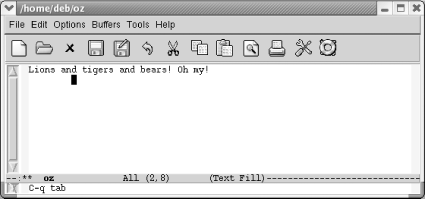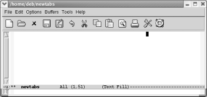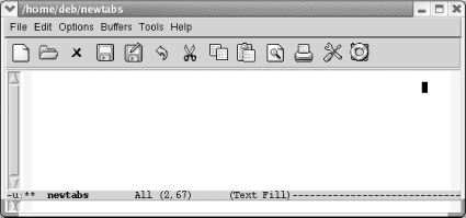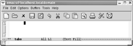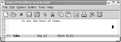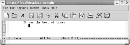 7.1. Using TabsTabs provide an easy way to do some simple formatting. While we were revising this book, we found that the way Emacs handles tabs has changed a great deal. This section describes first how Emacs works by default and then discusses what you can do to change the default behavior to meet your needs. 7.1.1 How Emacs 21 Handles Tabs by DefaultIf you open a new file in text mode, tabs are set every eight spaces by default. (Programming modes have their own indentation behavior; see Chapter 9 for details.)