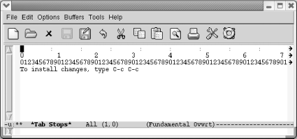 If you press Enter but don't press Tab at all, the indentation level moves back to the left margin. Changing tabs to align with each word can be helpful, if, for example, you're typing tables. However, the default tab behavior may not be helpful to you in all situations. If you are interested in changing the default behavior, read on and we'll describe how to get Emacs to do what you want it to do. 7.1.2 Changing Tab StopsBy default (and if text is not lining up with some previous line of text), tabs are set every eight characters. Emacs allows you to change the positions of the tab stops. To change the tab stops, type M-x edit-tab-stops. A *Tab Stops* buffer appears.
