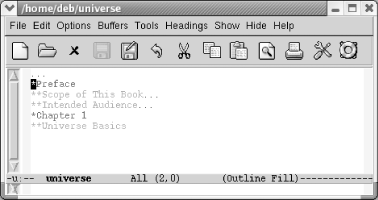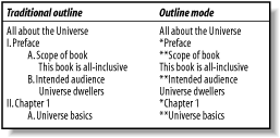 7.4. Using Outline ModeWhen you're writing something, whether it's a book, a long paper, or a technical specification, getting a sense of organization as you go along is frequently difficult. Without a sense of structure, it is hard to expand an outline smoothly into a longer paper or to reorganize a paper as you go along. The words get in the way of your headings, making it hard to see the forest for the trees. Outline mode provides a built-in solution to this problem. This mode gives you the ability to hide or display text selectively, based on its relationship to the structure of your document. For example, you can hide all of your document's text except for its headings, thereby giving you a feel for the document's shape. When you're looking at the headings, you can focus on structure without being concerned about individual paragraphs. When you've solved your structural problems, you can make the text reappear. Outline mode is more useful for documents with several levels of headings (or for long programs) than for plain outlines containing very little text. The longer a document is, the harder it is to get a quick feel for the overall structure; it is in such a situation that outline mode's ability to hide and show portions of the text comes in handy. Outline mode requires you to follow some special conventions in your outline or document. Figure 7-1 shows an outline in traditional format and the same outline prepared for outline mode. On the left, we show a "traditional" outline; on the right, we show the same outline, after being prepared for outline mode: Figure 7-1. Traditional Outline versus Outline Mode![]() Whereas traditional outlines use a hierarchical scheme of Roman numerals, uppercase letters, numbers, and lowercase letters for heading levels 1 through 4, outline mode by default expects to see one asterisk (*) for a first-level heading, two for a second-level heading, and so on. Lines that don't start with an *, such as "This book is all-inclusive," are referred to as body lines. Notice that Emacs expects to see the asterisk in the first column. You can use traditional outline indentation, provided that the asterisks start in the first column.[3]