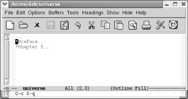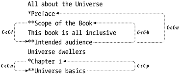 The sample outline has only two body lines. As we developed the book, though, we'd gradually add more and more body: "This book is all-inclusive" would be replaced by a substantial chunk of the preface, and other body lines later in the outline would turn into the text for Chapter 1. When used properly, outline mode removes the distinction between outlining and writing. As your outline grows and becomes more detailed, it can gradually become your paper. 7.4.1 Entering Outline ModeTo start outline mode, type M-x outline-mode Enter. Outline appears on the mode line. (Outline mode is also available as a minor mode; we'll discuss that later in this section.) After you are in outline mode, you can use special commands to move quickly from one part of the outline to another. C-c C-n moves to the next heading or subheading; C-c C-p moves to the previous one. C-c C-f moves to the next heading of the same level, so you can use this command to move from one first-level heading to another throughout the outline, or from one second-level heading to another within a given entry. C-c C-b moves backward to the previous heading of the same level. If you want to move from a second-level heading to its first-level heading, up a level in the outline structure, you type C-c C-u. (If you are on a first-level heading already, C-c C-u beeps because it can't move to a higher level.) Figure 7-2 illustrates how these cursor commands would work on our sample outline. Figure 7-2. Moving around in outline mode![]() These commands make it easy to solve a lot of organizational problems. If you often think, "I know I'm writing about widgets, but I can't remember the bigger point I'm trying to make," type C-c C-u to get to the next higher level of the outline. If you want to figure out how widgets relate to the other topics within the section, use C-c C-b and C-c C-f to move backward and forward to your other headings. 7.4.2 Hiding and Showing TextThe most important feature of outline mode is the ability to selectively hide or show different portions of your text. The ability to see a skeletal view of a long document with outline mode is its best feature; it's much easier to evaluate the structure of a document when you can hide everything but the headings and see whether it is coherent or in need of some reorganization. Although it sounds like something out of a detective novel, the hide-body command, C-c C-t, hides all the body (or text) lines but leaves all the headings (lines that begin with an asterisk) visible. Wherever Emacs hides text, it places an ellipsis (...) on the corresponding heading line. The ellipsis tells you that some hidden text is present. The buffer itself is not modified; you'll notice, if you watch the left side of the mode line, that the asterisks that indicate a modified buffer don't appear. If you save a file and exit while some text is hidden, Emacs saves the hidden text along with what you see displayed; hiding text in no way implies losing text. The next time you read the file, Emacs shows all text that was hidden. Using the hide-body command is a good way to get a feel for the structure of a long document. You can then type C-c C-t and see only the headings without the text. For example, let's start with the simple outline we gave above and hide the body.